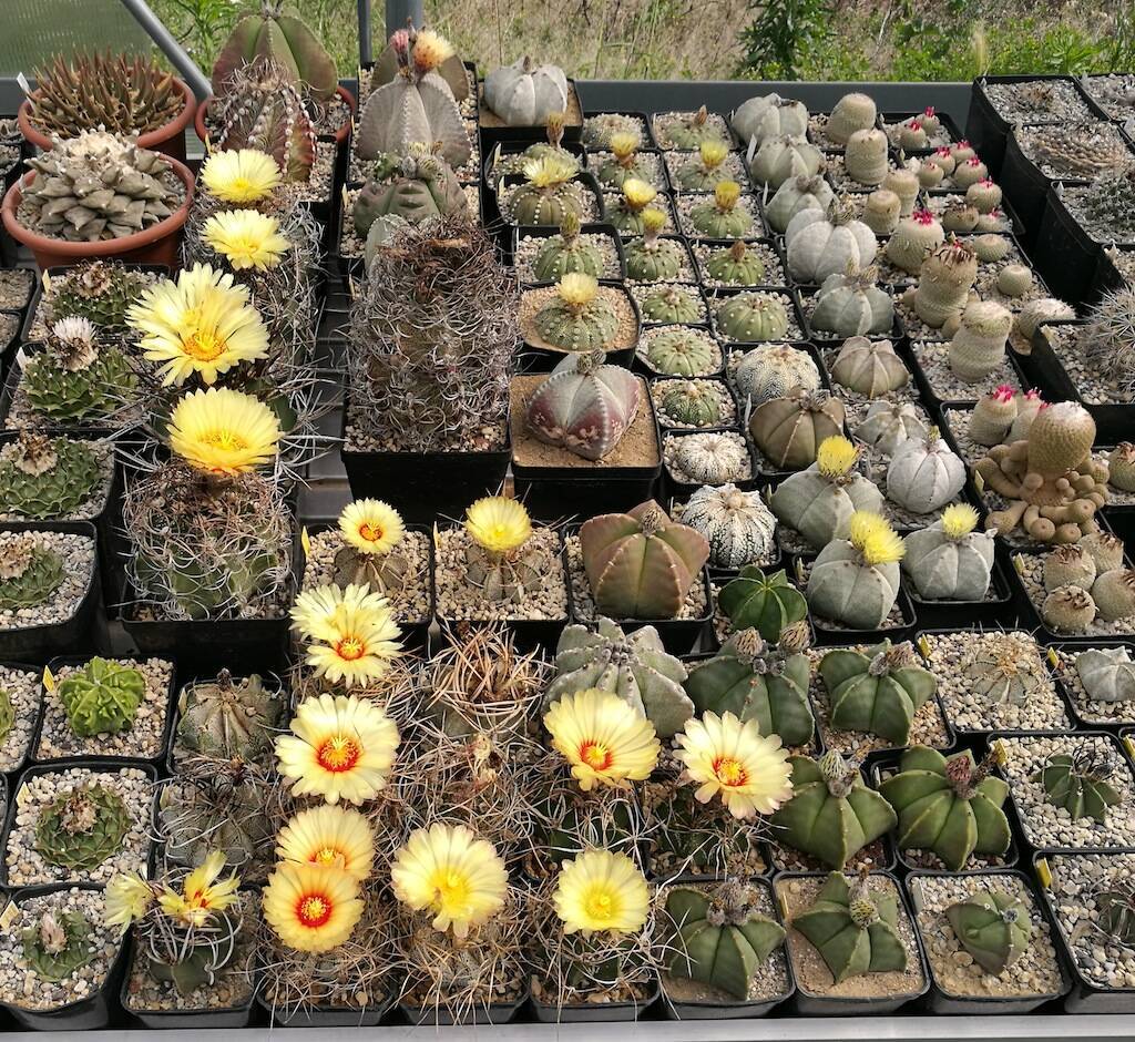 Dalla seconda metà di maggio esplodono i bouquet degli Astrophytum. Si tratta di un genere molto generoso, che regala fioriture abbondanti, appariscenti e a più riprese per diversi mesi, fino all’autunno. I fiori sono quasi sempre di colore giallo, di varia intensità, e in alcuni casi, come per le specie asterias e capricorne, hanno la gola rossa. (…)